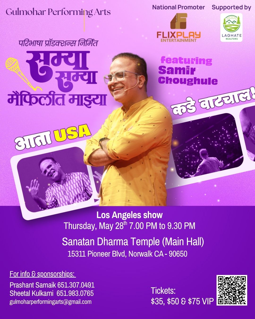 Get ready for an unforgettable evening of laughter and entertainment as acclaimed Marathi actor and comedian Samir Choughule brings his hit show Samya Samya Maifilit Majhya to Los Angeles! Widely loved for his standout performances on the popular comedy show Maharashtrachi Hasya Jatra, Samir’s impeccable comic timing and relatable humor have made him a household name. Hosted by Gulmohar Performing Arts, this lively and heartwarming show promises an evening filled with laughter, storytelling, and a celebration of Maharashtrian culture. Don’t miss this rare opportunity to experience one of Maharashtra’s finest entertainers live in LA!